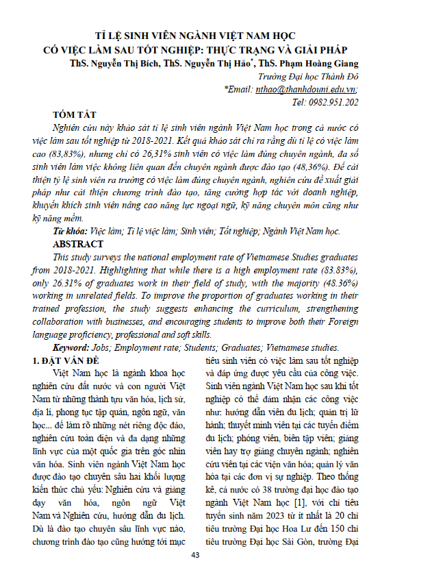 Tỉ lệ sinh viên ngành Việt Nam học có việc làm sau tốt nghiệp: Thực trạng và giải pháp