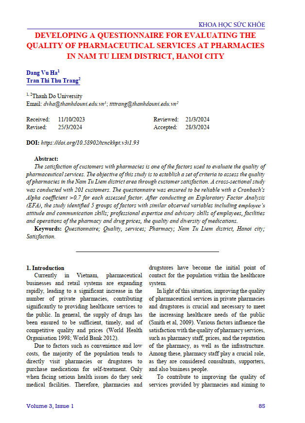 Factors influencing pharmacy students’ satisfaction with pharmacy education quality: A cross-sectional study at a private university in Vietnam