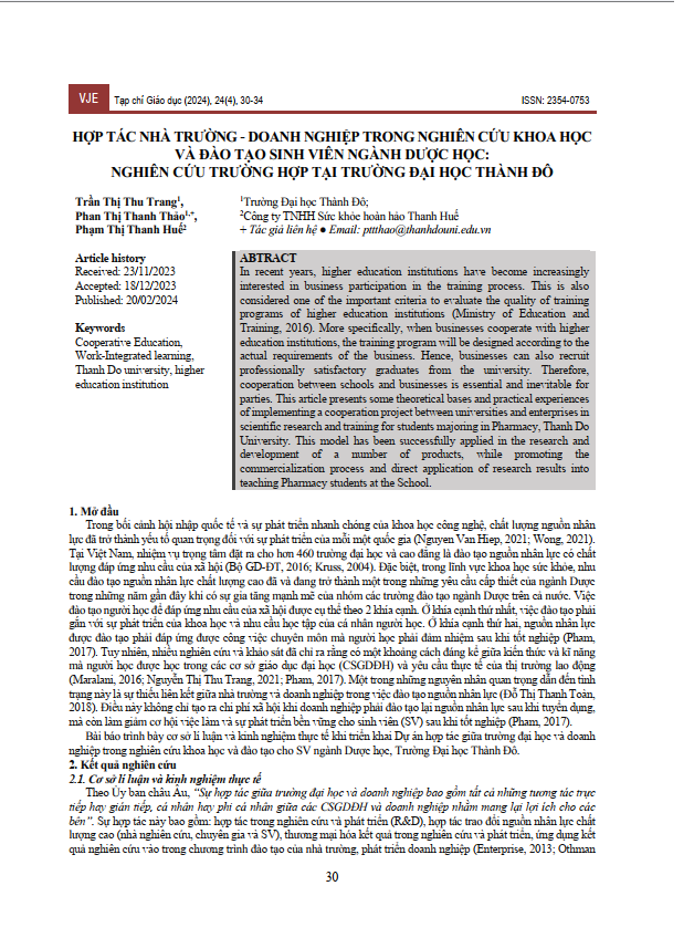 Hợp tác Nhà trường – Doanh nghiệp trong nghiên cứu khoa học và đào tạo sinh viên ngành Dược học: Nghiên cứu trường hợp tại Trường Đại học Thành Đô
