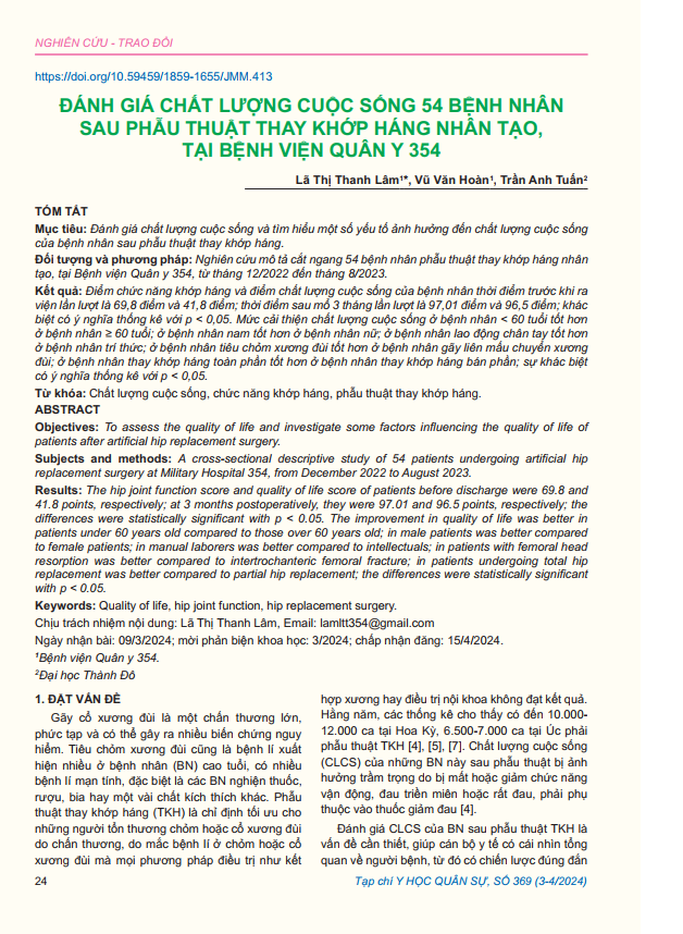 Đánh giá chất lượng cuộc sống 54 bệnh nhân sau phẫu thuật thay khớp háng nhân tạo, tại bệnh viện quân y 354