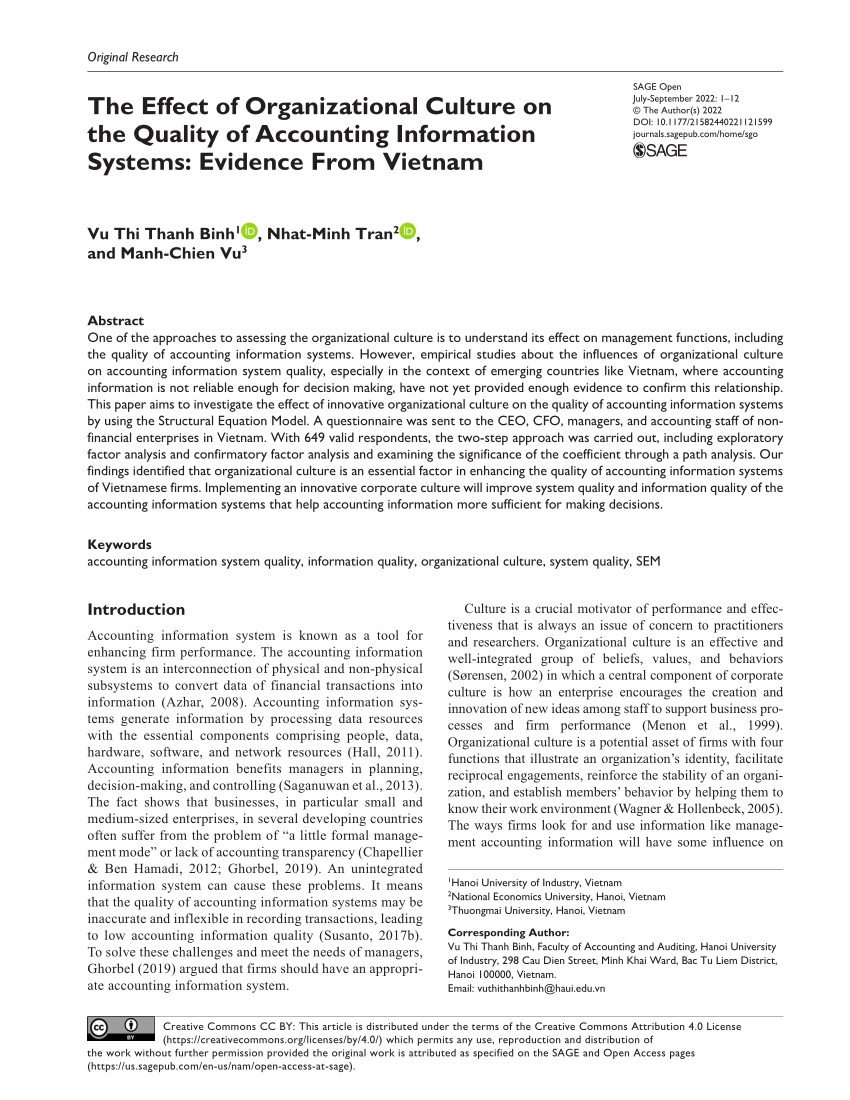 The Effect of Organizational Culture on the Quality of Accounting Information Systems: Evidence From Vietnam